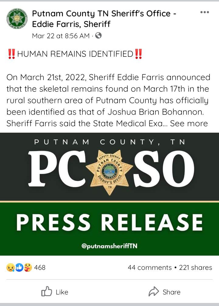 PUTNAM COUNTY, TN – It’s very likely you’ve seen in the news this week reports that remains had been found in Cookeville, TN. These remains belonged to a young man who had been missing for nearly the last year, and whose family had been working night and day to find peace. After the discovery, the Putnam County Sheriff Eddie Farris issued a press statement.