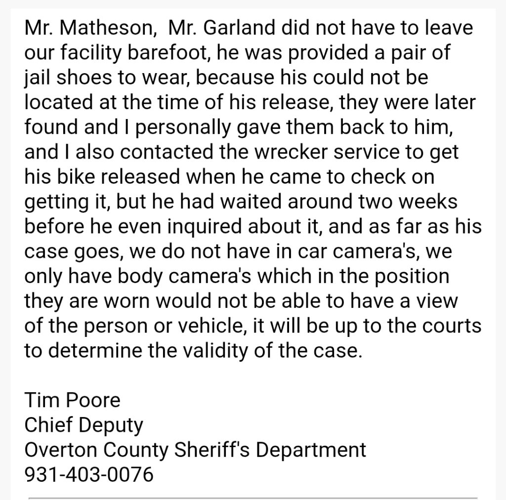 Mr Garland was arrested the next day, July 26, after the deputy swore an affidavit against him. Mr. Garland was in jail from July 26th to August 7th, and had his motorcycle impounded.
