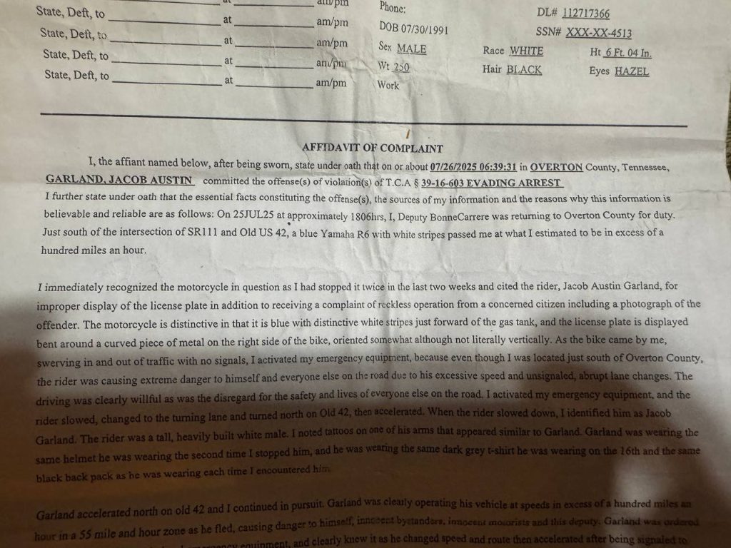 The Patriot Punk Network was recently made aware of an arrest in Overton County where a man, Jacob Garland, was charged for Evading Arrest on his motorcycle.